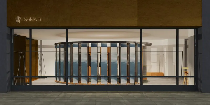 新店舗「Goldwin London」では、文化と革新を美しく融合させることを目指しています。その核となるのが、ガラスのファサードに囲まれた環状の「社」で、ブランドのスタイルと理念を発信するプレゼンテーション空間となっています。この空間は、訪れる人々を物語の中心へ誘い、外部の喧騒とは対照的な静謐な空間を提供します。