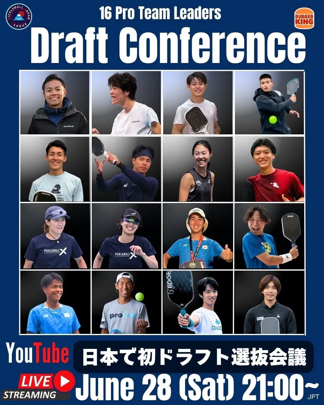 2025年6月28日(土)21時から、注目の「PJFピックルボールジャパンリーグ BURGER KING® CUP」のドラフト会議がYouTubeで完全ライブ配信されます。とてもユニークな形式で、16チームのキャプテンが各々のチームを形成するために選手を指名していく姿を、この瞬間に立ち会えるのはファンにとっても特別な体験となるでしょう。