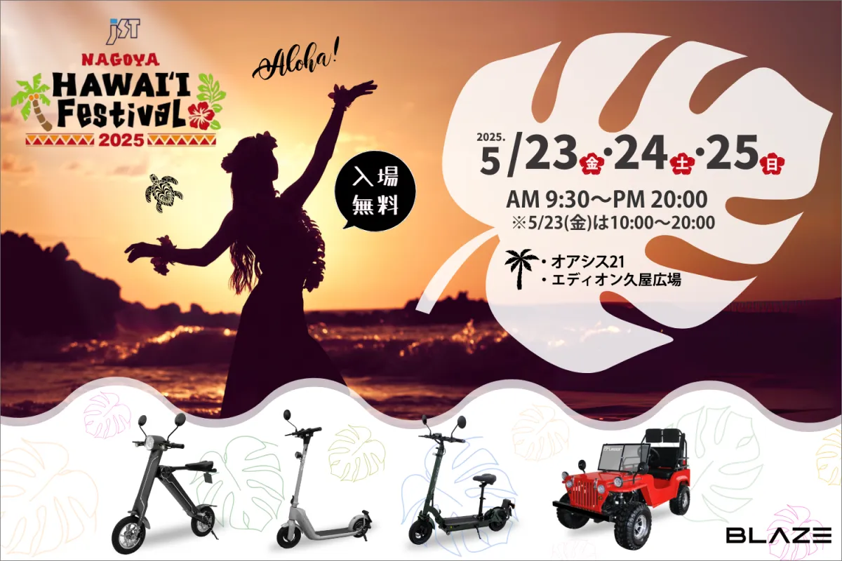 2025年5月23日から25日までの3日間、名古屋市で開催される「JST Nagoya HAWAI'I FESTIVAL 2025」にて、電動モビリティのメーカーである株式会社ブレイズが出展することが決まった。このイベントでは、ハワイの文化や体験を存分に楽しむことができる。