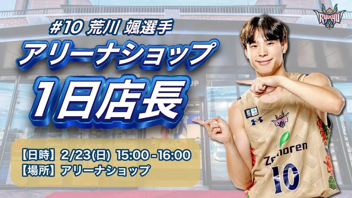 2025年2月23日、沖縄アリーナの1階に位置するアリーナショップにて、選手が1日店長を務める特別イベントが開催されます。この日の主役は、#10 荒川颯選手。彼が店頭でファンと直接交流し、元気を届けてくれる貴重な機会です。
