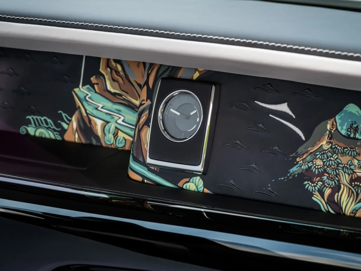 ファントム・エクステンデッドは、ニンイェ・パープルという深紫色を基調にし、対照的なイングリッシュ・ホワイトが特徴です。特に注目すべきは、手描きのギャラリー・アートワーク。ここでは、仏教文化におけるアプサラス(天女)の舞が表現されています。1,344個の光ファイバーによる星空の演出も見逃せません。