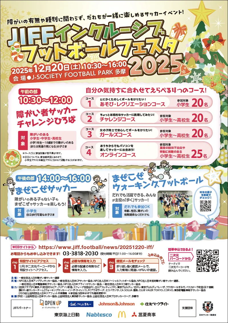 2025年12月20日(土)、東京都多摩市のJ-SOCIETY FOOTBALL PARKにて、『JIFFインクルーシブフットボールフェスタ2025』が開催されます。このイベントは、一般社団法人日本障がい者サッカー連盟(JIFF)により、障がいの有無に関わらず、サッカーを通じて相互理解を促進し、共生社会の実現を目指すものです。