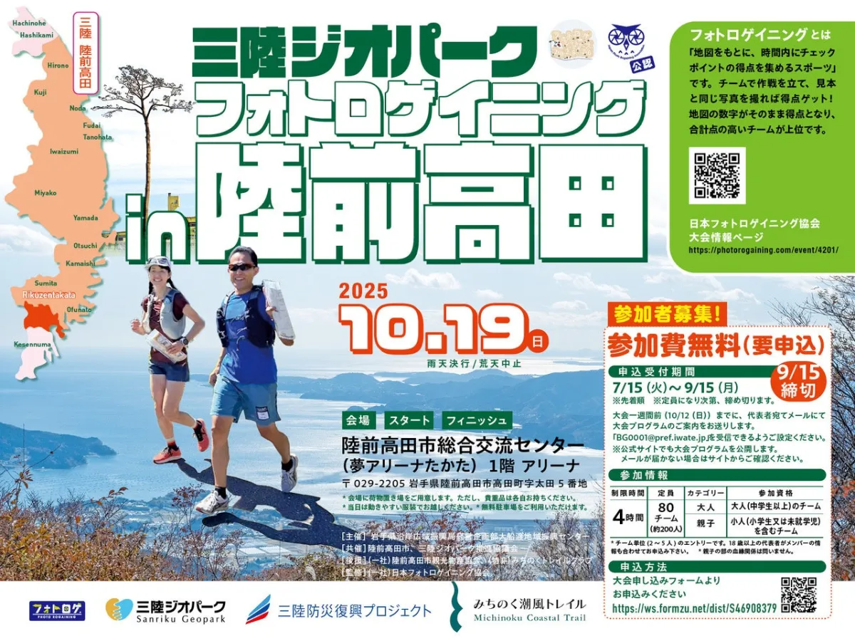 2025年10月19日、岩手県の美しい自然に囲まれた陸前高田市にて、「三陸ジオパーク フォトロゲイニング in 陸前高田」が開催されます。この大会は日本フォトロゲイニング協会が公認する公式のスポーツイベントで、仲間と楽しみながら自然を舞台に競い合うことができます。フォトロゲイニングとは、地図を使いながら時間内に指定のチェックポイントをクリアし、得点を競うゲームです。大人から子どもまで楽しめるこのイベントは、家族や友達と一緒に冒険を楽しむ絶好の機会です。
