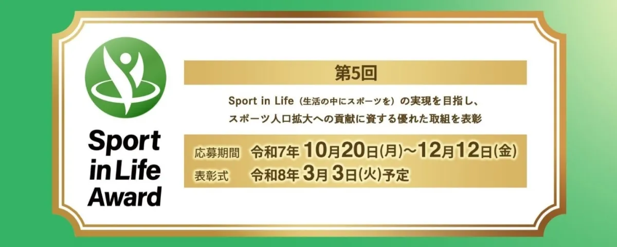 スポーツ庁が企画する「Sport in Lifeプロジェクト」は、誰でも日常の中でスポーツとつながれる社会の実現を目指しています。プロジェクトの一環として開催される「Sport in Lifeアワード」では、スポーツ人口の増加に貢献する優れた取り組みを表彰し、社会に広く発信することを目的としています。
