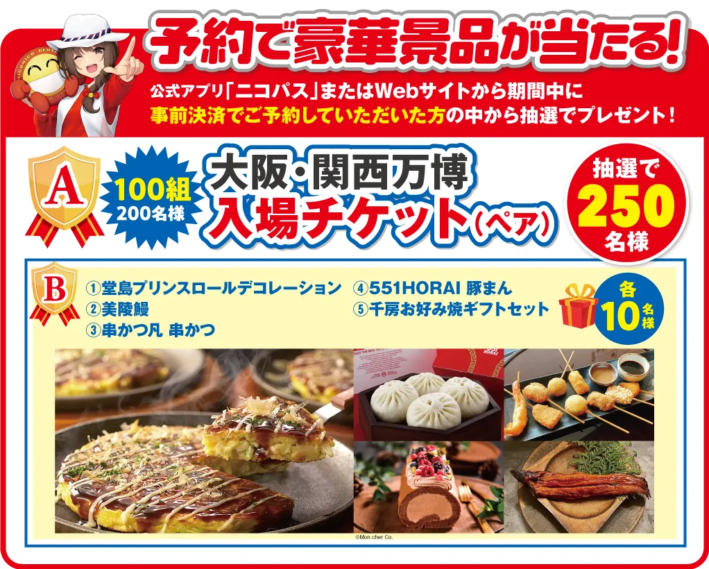 当キャンペーンのプレゼント商品は多岐にわたります。A賞として大阪・関西万博の入場チケットペアが250名に、また大阪の名物を楽しめるグルメギフトセットが抽選で計40名にプレゼントされます。