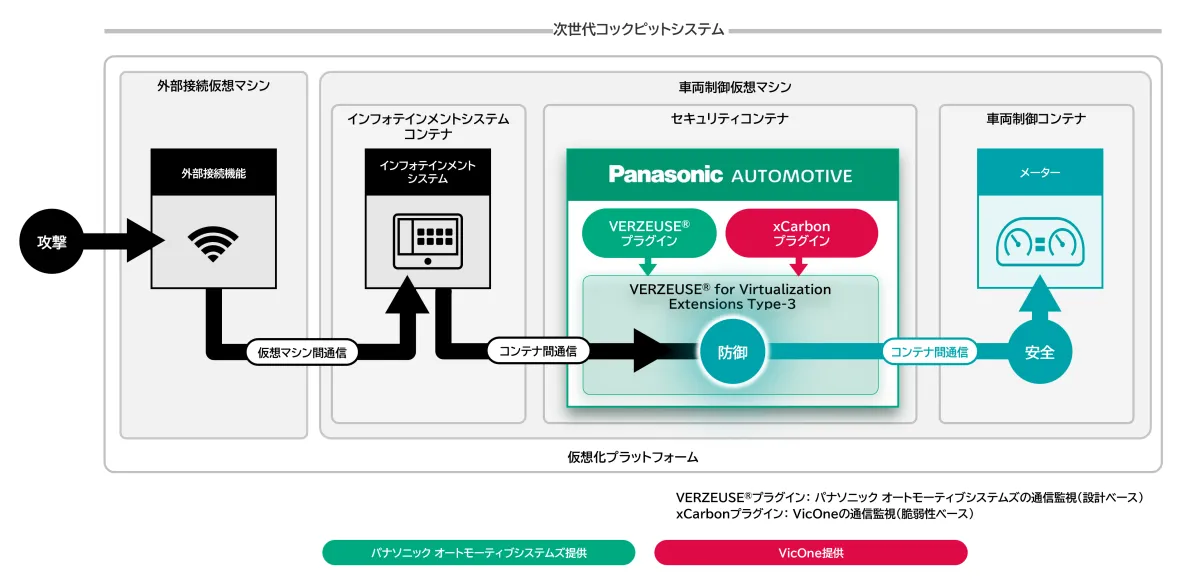 本提携は、VicOneが提供する車両向け組込型セキュリティソフト「xCarbon」と、パナソニックの「VERZEUSE® for Virtualization Extensions Type-3」の統合から成ります。これにより、車両のインフォテインメントシステムと重要な制御機能との間での安全な通信が可能となり、攻撃者からの侵入を防ぐ新たな防御機能が実現します。