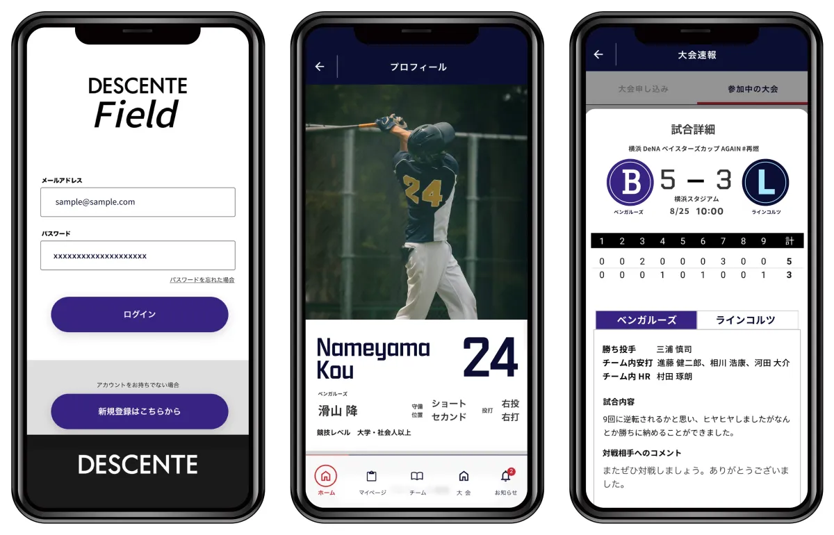 「DESCENTE Field」は、ユーザーがチームの作成や個人プロフィールの作成、大会へのエントリー、さらには試合成績の管理を行える一元管理ツールです。これにより、チームメンバーや大会参加の手続きがスムーズに行えるようになります。特に、運営者にとっては、参加者や試合結果を簡単に管理できるため、情報共有や結果の報告が非常に効率的になります。