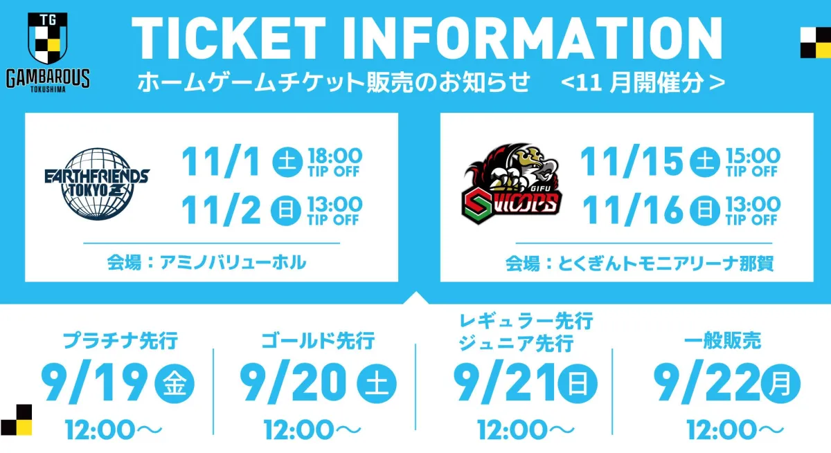 徳島ガンバロウズが、2025-26シーズンの11月に開催されるホームゲームの観戦チケットの販売を開始することをお知らせします。チケットの購入を希望される方は、販売スケジュールに注意を払い、ぜひ会場での熱い応援に参加してみてください。
