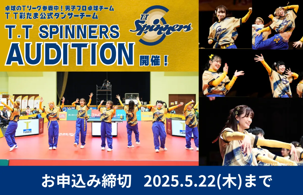 卓球のプロリーグ『Tリーグ』に参加するT.T彩たまの公式ダンサー、T.T Spinnersが新メンバーオーディションを開催します。ダンスを通じて卓球の試合を盛り上げてくれる情熱的なダンサーを求めています。この機会に応募して、シーズンを共に楽しんでみませんか?