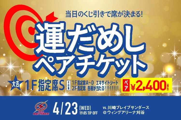 大人気の「運だめしペアチケット」が、再度販売の運びとなりました! シーホース三河からの感謝の気持ちを込めて、試合観戦をより特別な体験にするために、試合日当日のくじ引きで席が決まるという刺激的なチャンスです。