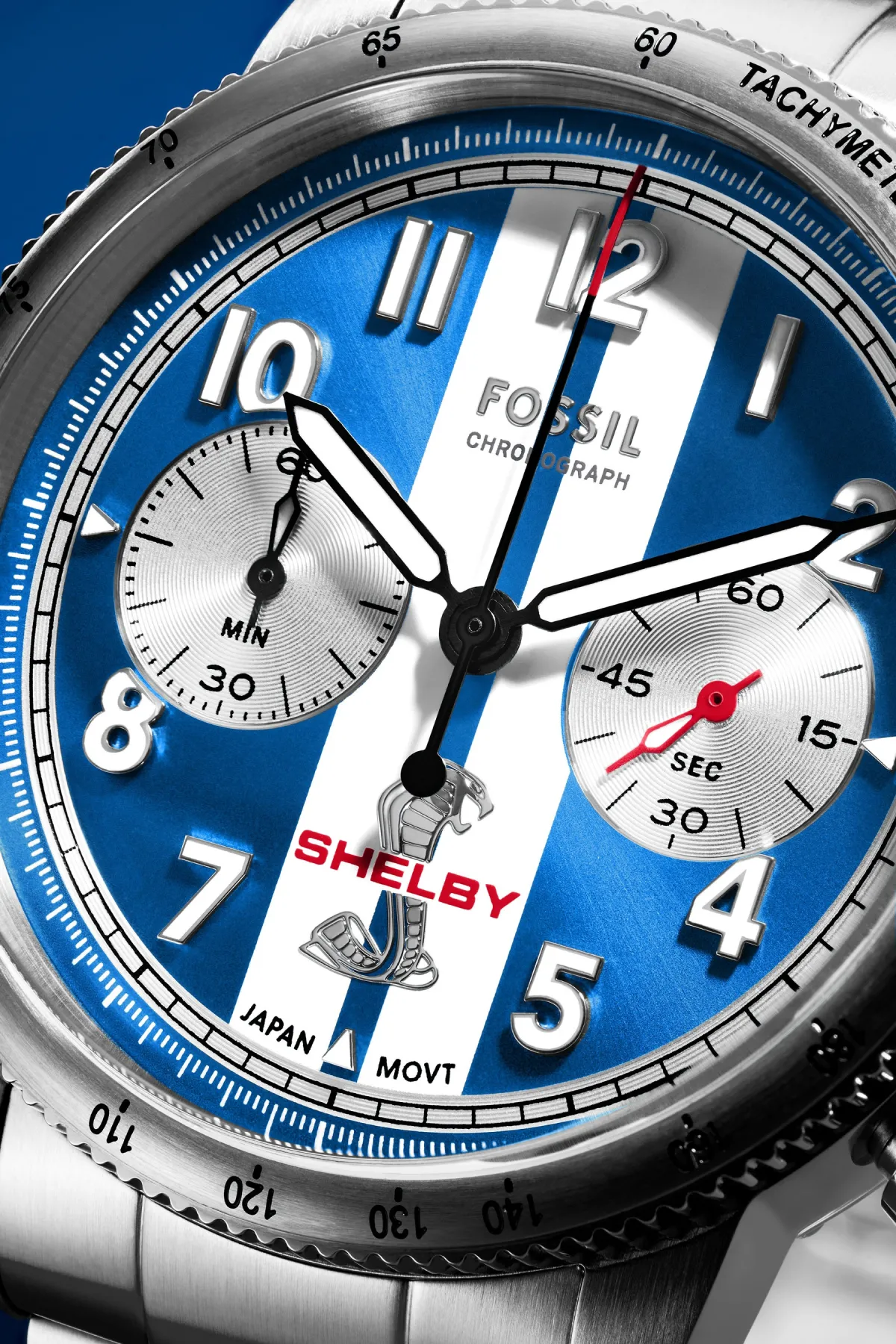 1960年代のモータースポーツ界で名を馳せたキャロル・シェルビーが手がけたシェルビー・コブラ。この名車は、ル・マン24時間レースにおいてアメリカ人として初の総合優勝を果たし、スポーツカーの歴史に名を刻んでいます。その象徴的なデザインとレーススピリットが、フォッシルの洗練されたクラフトマンシップと絶妙に融合することで、時計のディテールに美しく落とし込まれています。