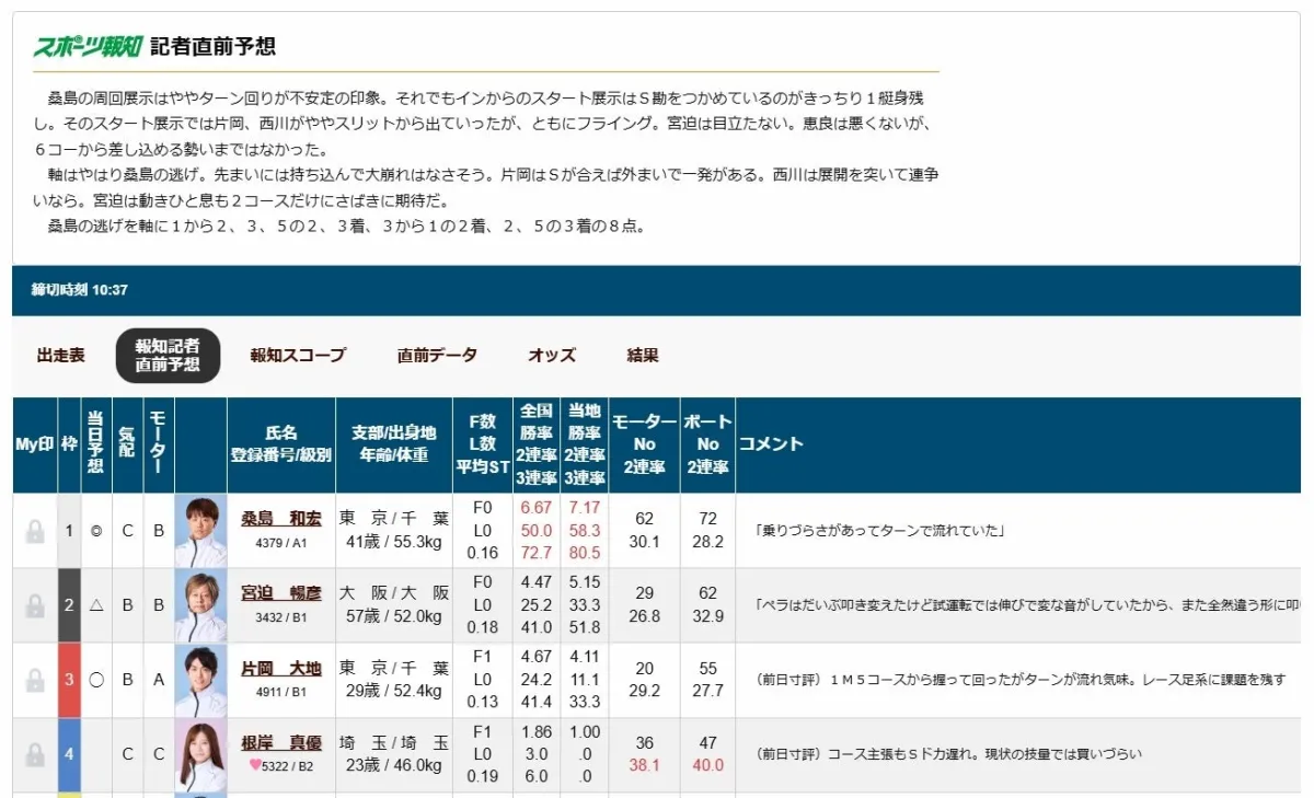 「直前予想」とは、選手たちの実際の走行データに基づいて行われる舟券予想のことで、特に「展示航走タイム」が重要な指標になります。展示航走とは、レース前に選手たちが行う試運転のことで、そのタイムや走り方は本番レースに大きな影響を与えます。選手たちの調子やモーターの状態、さらには天候なども予想の精度を左右します。これらの情報を元にした「直前の気配」を捉えることが、勝利へとつながるゲームのカギです。