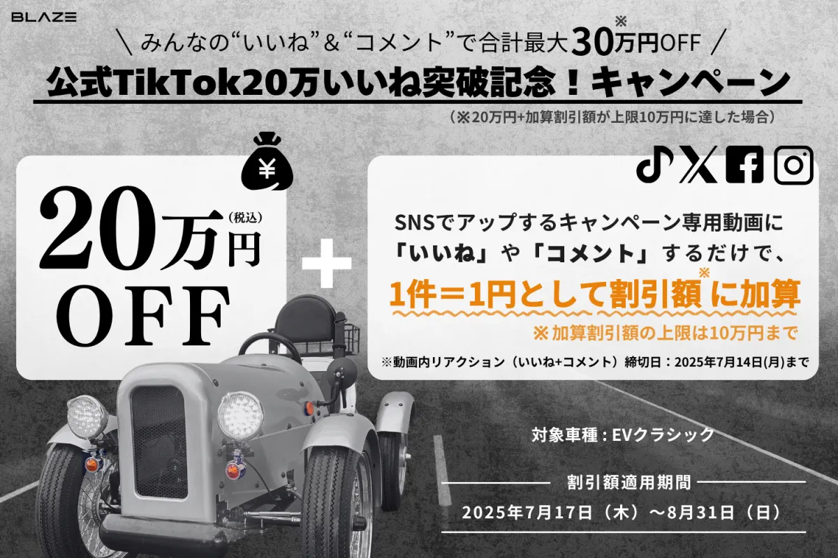 株式会社ブレイズが、人気の電動ミニカー『EV CLASSIC(EVクラシック)』を対象にしたSNS参加型割引キャンペーンを発表しました。このキャンペーンは、公式TikTokアカウントの全動画の総いいね数が20万件を超えたことを記念して実施されるもので、感謝の意を込めた楽しい参加型の企画となっています。