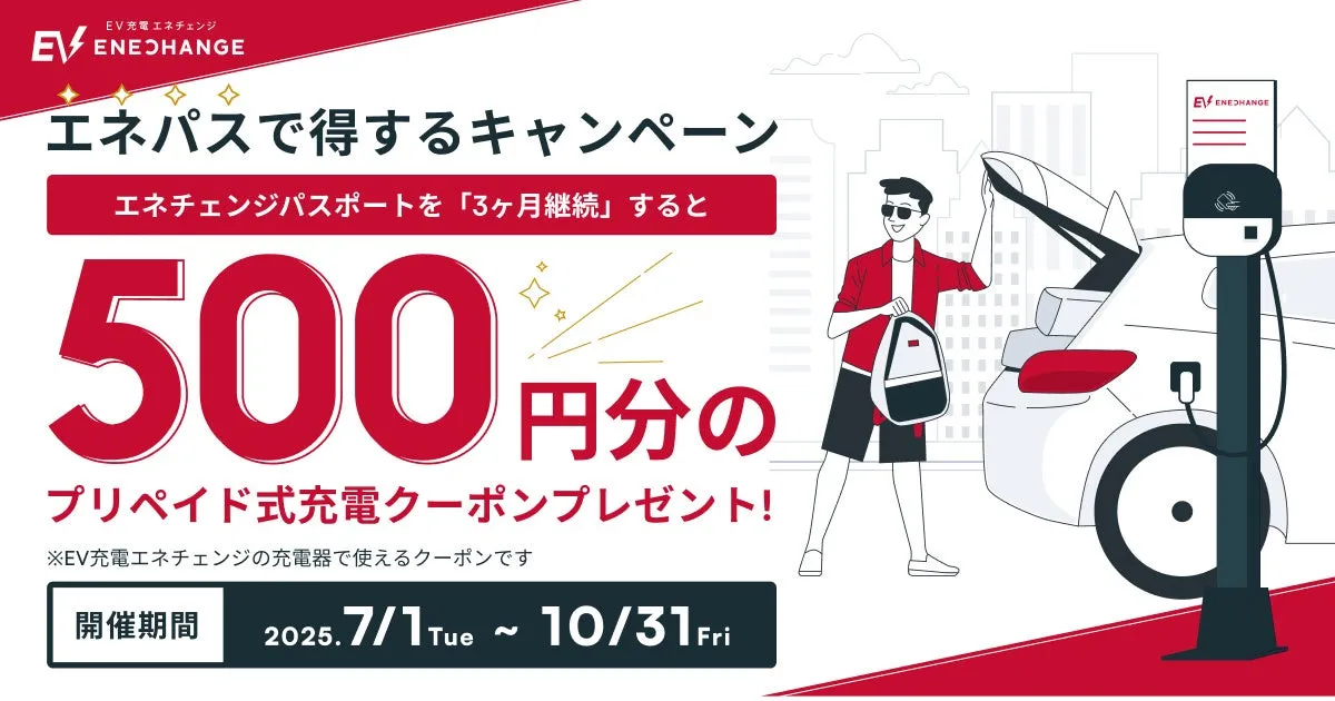 「エネパスで得するキャンペーン」は、エネルギーを有効活用する新たな機会です。このキャンペーン期間中に「エネチェンジパスポート」を3ヶ月間連続で利用された方には、EV充電エネチェンジで使用できる500円分のプリペイド式充電クーポンがプレゼントされます。