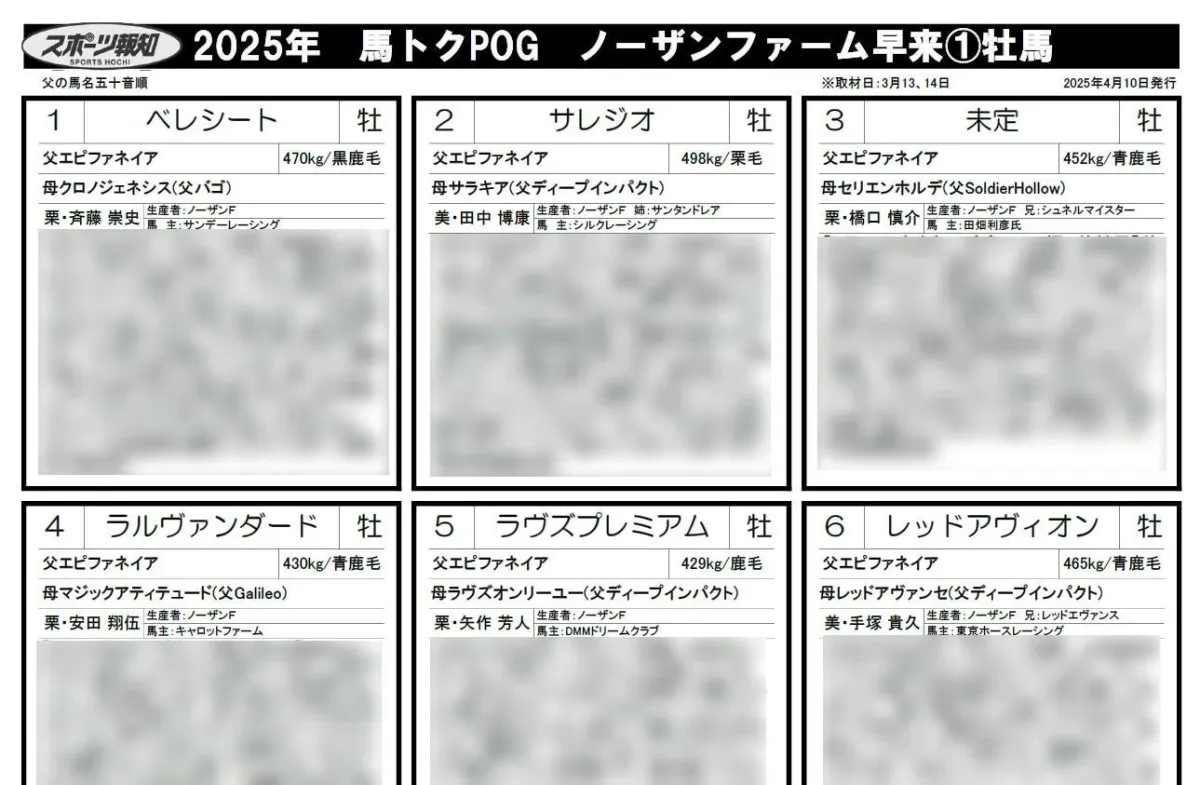 2023年4月10日、スポーツ報知が発表したPOG情報は、特に注目すべきです。社台グループの牧場で育成された2歳馬の情報が詰め込まれたこのプリントは、各コンビニにあるマルチコピー機で購入可能です。合計で600円の「馬トクPOGプリント2025(4牧場入り)」や、各牧場別で300円の商品が用意されており、入手しやすい価格帯で設定されています。