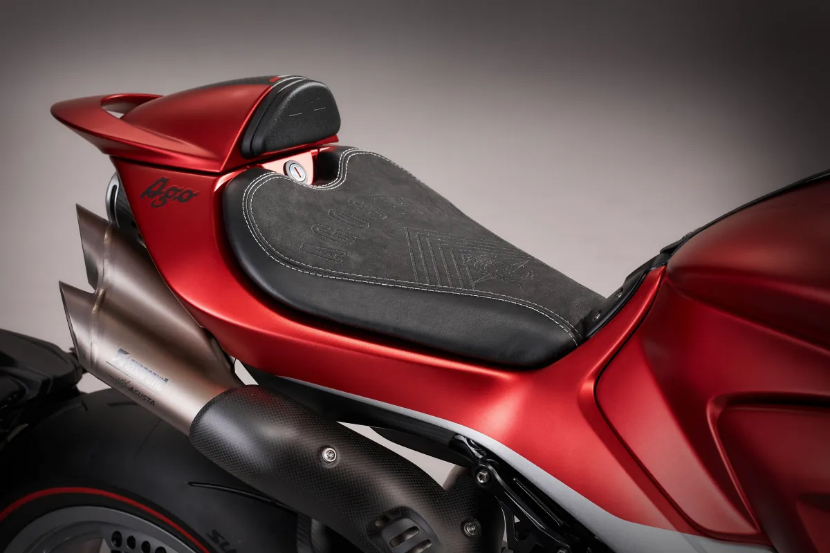 「Superveloce 1000 Ago」は、現代のレーシングスピリットを反映するよう設計されています。最先端の技術、印象的なデザイン、特別な仕上げが繊細に組み合わさり、唯一無二の存在感を持つモデルに仕上げられています。ALCANTARAが果たす役割は特に重要で、シートは洗練されたブラックシェードで仕上げられ、機能性やグリップ感、快適さを兼ね備えています。そして、レーザー彫刻によるカスタマイズが施され、アゴスティーニ氏のレーシングスーツをもとにした象徴的なアローストライプや、彼の名、さらにMV Agustaのロゴがけて、特別感を高めています。
