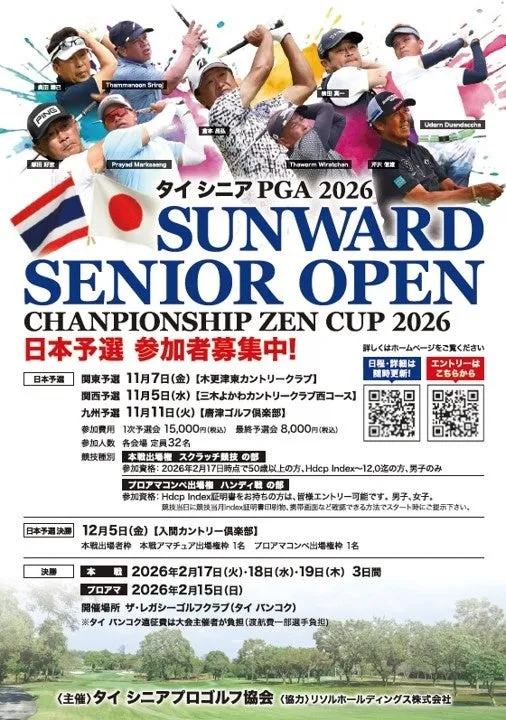 2026年、タイ・バンコクで開催される「SUNWARD SENIOR OPEN CHAMPIONSHIP ZEN CUP 2026」に向けて、リソル株式会社が協力し、日本初となる予選会が実施されることが決定しました。この国際的なシニアプロゴルフトーナメントは、日本とタイのゴルフ交流を目的としており、両国のシニアプロ選手がうなる舞台として注目が集まっています。