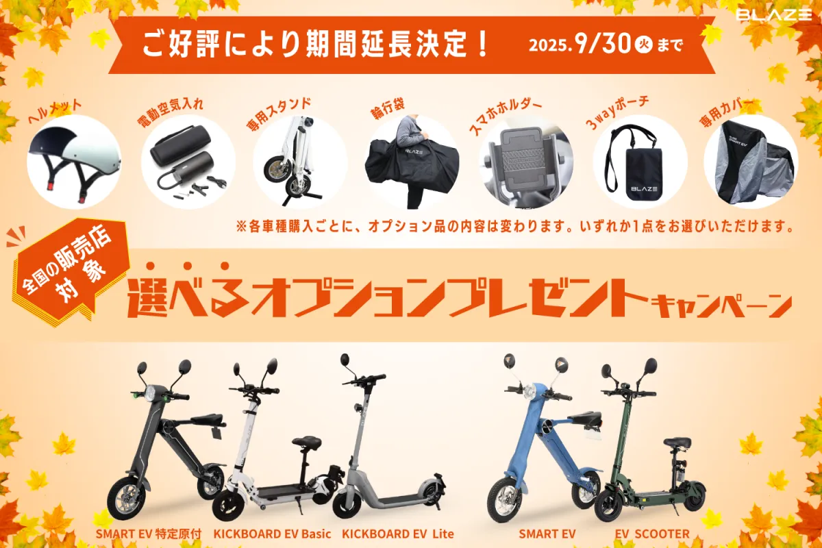 愛知県名古屋市に本社を置く株式会社ブレイズは、2025年7月7日に開始した「選べるオプションプレゼントキャンペーン」を好評を受けて、期間を9月30日まで延長することを発表しました。このキャンペーンは、全国の販売店でブレイズの2輪電動モビリティを購入したお客様に、便利で実用的なオプション品を1点プレゼントする特別な機会です。