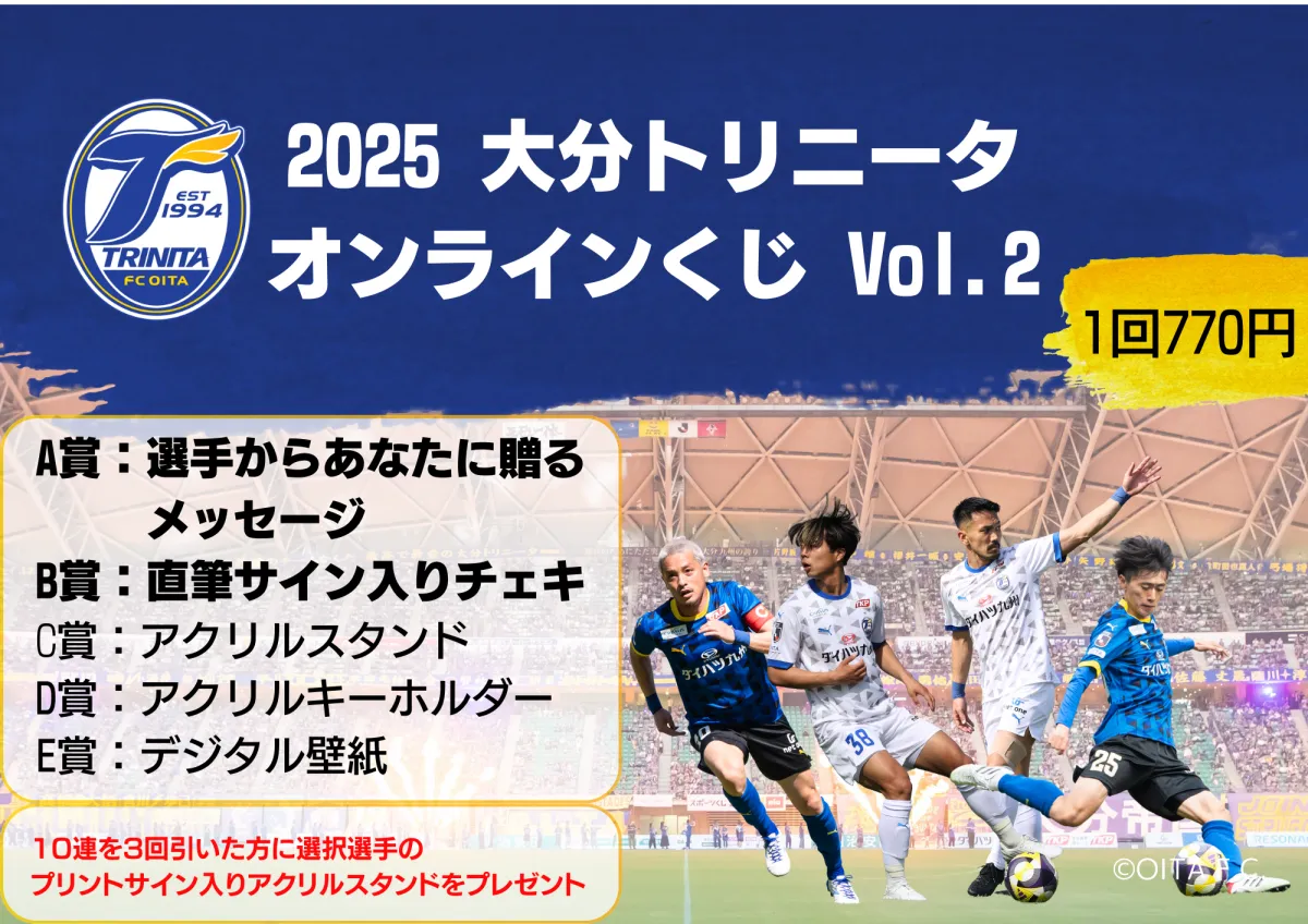 「2025 大分トリニータオンラインくじvol.2」では、選手からの特別なメッセージ動画や、直筆サイン入りのチェキ、アクリルスタンドなど、多彩な賞品が用意されています。購入は1回770円(税込)から可能で、10回購入すると、さらにお得な価格で手に入れることができます。10回引くことを3回行うと、30連特典として、希望選手のプリントサイン入りアクリルスタンドもプレゼントされます。この特典をゲットするチャンスを逃さないようにしましょう。