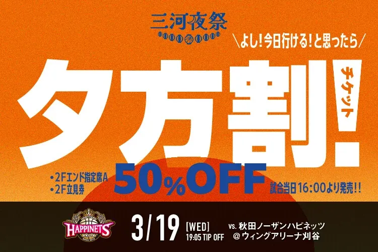 シーホース三河にご声援をいただき、ありがとうございます。新たに登場した「夕方割!チケット」で、仕事や学校の後でもお得に試合観戦を楽しんでみませんか?