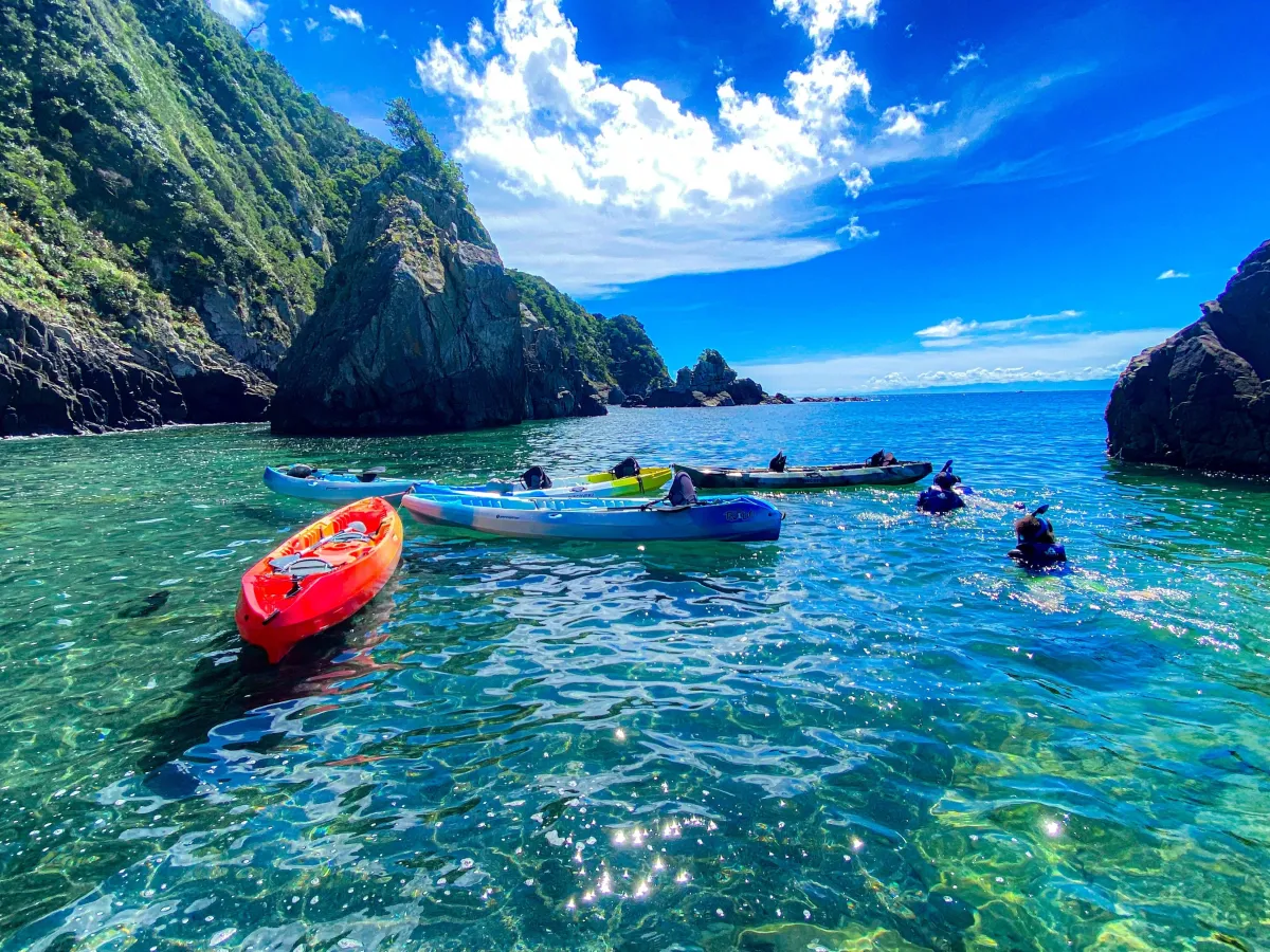 御座の海には、沖縄から流れ着く魚や黒潮の影響で生息する熱帯魚が豊富に存在します。ツアー中は、ガイドが先導しながらカヤックで海へ漕ぎ出し、透明度の高い海中世界を間近に観察することができます。参加者は、快適なライフジャケットとシュノーケルマスクを無料で貸し出され、安全にアクティビティを楽しむことができます。