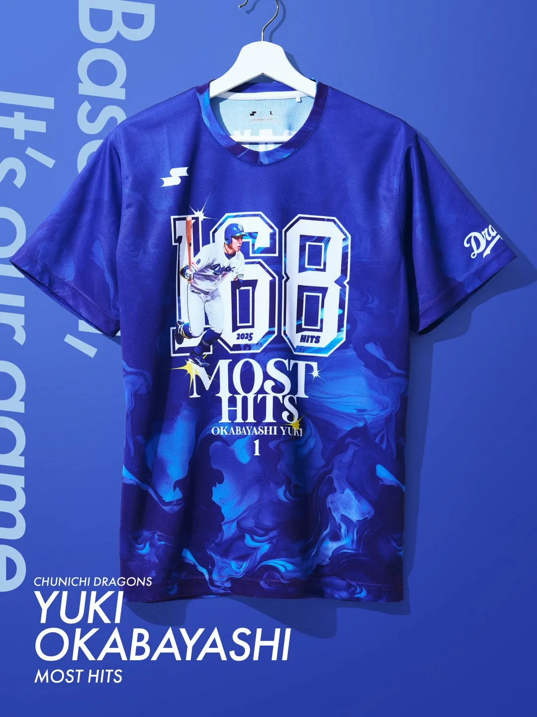 この記念Tシャツには、中日ドラゴンズをイメージした鮮やかなブルーのマーブル柄が施されており、力強さとスピード感が表現されています。胸元には「168 HITS」と岡林選手の力強いバッティング姿がデザインされ、中央には「MOST HITS」、「岡林」の名前と背番号の「1」が配置されています。また、左袖には球団のロゴが印刷されており、背面にも背番号と選手名がプリントされています。このように、シーズンの感動や選手たちの努力が感じられる特別な一枚です。