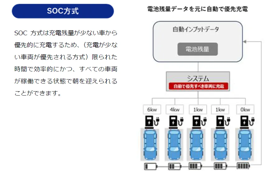 「e-mobilog」は、双日株式会社が提供する「EVオートチャージ」と連携することにより、その効果をさらに発揮します。「EVオートチャージ」は商用EV向けのクラウド型充電制御システムで、特許技術を駆使して充電マネジメントをシンプルに行います。これにより、商用EVを効率的に充電することができ、電力コストの削減や業務の省力化を実現しています。