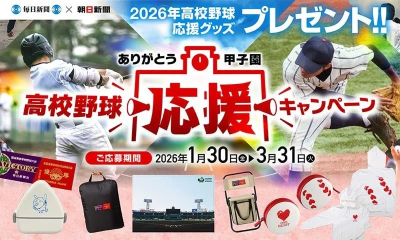 春の高校野球シーズンが到来しました。今回は、毎日新聞社と朝日新聞社が共同で「高校野球応援キャンペーン」を実施します。第98回選抜高等学校野球大会は3月19日に開幕予定。このイベントを盛り上げるために、様々なプレゼントも用意されており、ぜひ多くの皆様に参加していただきたいです!